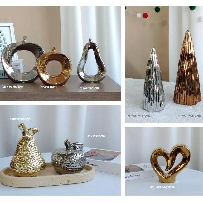 BYFs spesielle keramiske dekorer har frukt, juletrær og hjerter. De er laget av keramikk, og bruker en unik teknikk for å lage en metallisk glans, tilgjengelig i gull og sølv. Fruktdesignene (eple og pære) har glatte linjer, med unike utskjæringer og teksturer; Juletreet er tredimensjonalt, med rike teksturer; Og hjertet er enkelt og elegant og gir et snev av romantikk. Disse elegante, lys-luksuriøse brikkene er perfekte for stuen eller bordet ditt, og gir et snev av kunstnerisk teft og stil til hjemmet ditt. De er raffinert tilbehør som forbedrer stemningen i ethvert rom.